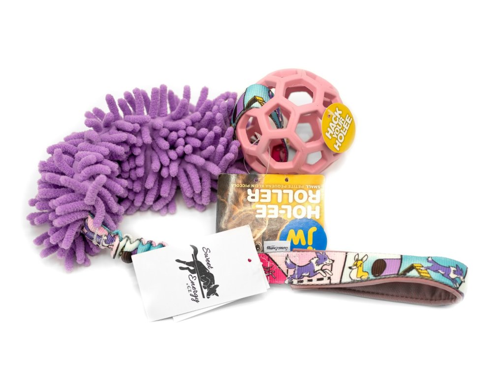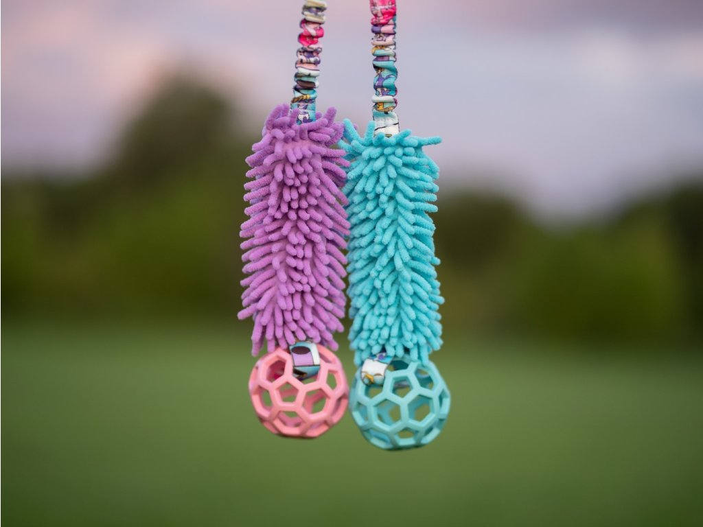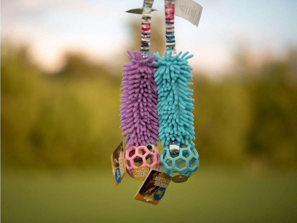 A tug toy with a microfiber mop, bungee (shock absorber), and JW Pet Hol-EE perforated ball, size SMALL (diameter 8 cm).