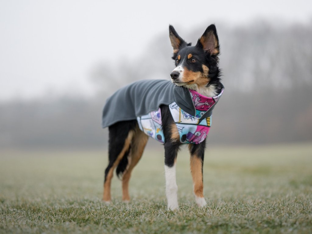 The top part is made from extra-warm fleece to keep your dog cozy in cooler weather. The bottom section features a stretchy elastic fabric with a softly brushed inner layer, allowing the suit to fit the dog’s body perfectly without limiting movement. Your dog can run, train agility or enjoy long walks in complete comfort.