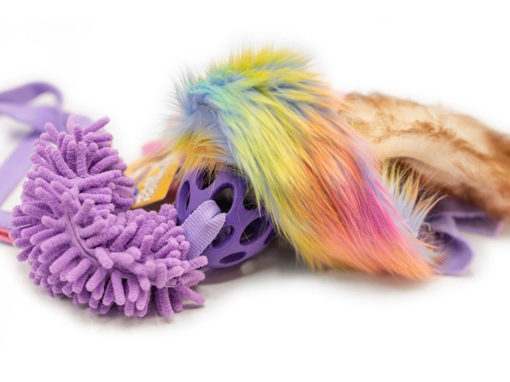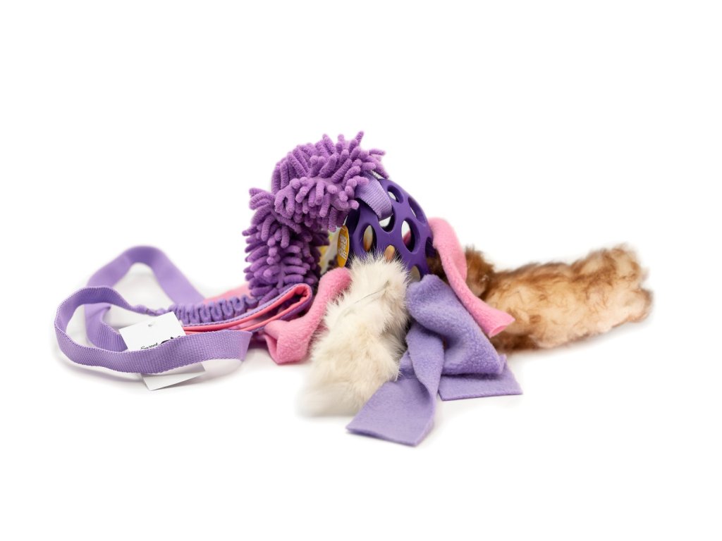 Více materiálů, mop jako základ. JW Pet Hol-ee rugby, ovce, králík, fleece a umělá kožešina.
